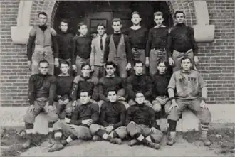 ![]() Coach Ray B. Thomas is seated at far right wearing a "Brown" shirt (his alma mater). Team captain Benjamin F. Proud is holding football, seated center. | |