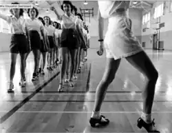 Eating disorders, particularly anorexia, spiked as women strived for slim bodies.[11] Women also believed it was possible to become "too skinny" which was also not desirable.[9] The slim figure was not only obtained through extreme eating habits, but basic at-home exercises were encouraged for women to maintain and develop trim figures.[9] One popularly advertised method for losing weight was dancing to aerobic "reducing" records. Before and after pictures were included to show women the results they should expect.[12][13]