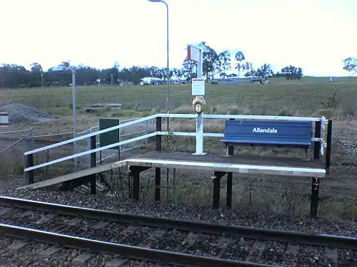 Allandale railway station was a railway station serving the Hunter Region town of Allandale. Opening to passenger services in 1869, it originally consisted of two brick platforms. The original station closed on 7 September 1978, and the station was demolished.[1] It was later reopened with smaller platforms, before being temporarily closed in 2002 due to the nearby bridge construction, and finally permanently closed on 9 September 2005, after railway works by the Australian Rail Track Corporation. There is no sign of the station now.