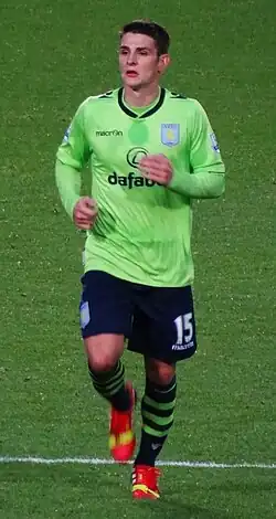 He made his debut on 15 September 2012, coming on as a second-half substitute for Stephen Ireland during a 2–0 win at home to Swansea City.[12] On 3 November, Westwood made his first league start for Villa in a 1–0 win away at Sunderland. The young midfielder was highly praised for his role in the win, alongside Barry Bannan.[13] On 15 July 2013, Westwood signed a new four-year contract keeping him at the club until summer 2017.[14] He scored his first goal for the club against local rivals West Bromwich Albion in a 2–2 draw at The Hawthorns.[15] On 29 March 2014, he scored in a 4–1 defeat away to Manchester United at Old Trafford.[16] On 3 May 2014, Westwood scored after 54 seconds against Hull City in a 3–1 home victory that helped ensure Villa avoided relegation.[17][18]