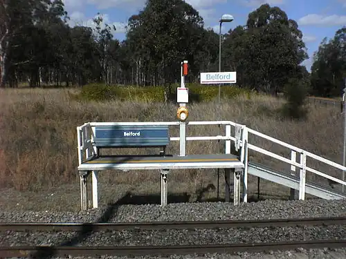 Belford railway station was a railway station on the Main North railway line. It served the settlement of Belford in the Hunter Region of New South Wales, Australia. Services were provided by CityRail's Hunter line until 4 September 2005, when the station was closed for safety reasons.[1]
