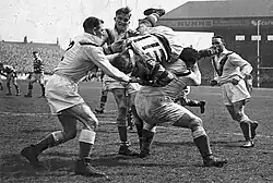 ![]() Eric Batten (left) and Ken Traill assist as Bradford Northern's Frank Whitcombe tackles Warrington's Jim Featherstone (№ 11) and Herbert Smith (right) looks on during Bradford Northern's 5-15 defeat by Warrington in the Championship Final during the 1947–48 season at Maine Road, Manchester, on Saturday 8 May 1948 | |||||||||||||||||||||||||||||||||||||||||||||||||||||||||||||||||||||||||||||||||||||
