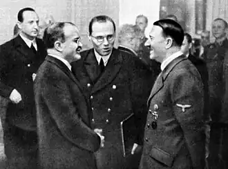 Born in Moscow, the son of a German businessman, Hilger spent most of his life in Russia until 1941. After World War I and the Russian Civil War, Hilger advocated German rapprochement with the Soviet Union and helped negotiate closer economic ties and the Molotov–Ribbentrop Pact.[5] In 1941, he warned Adolf Hitler and German Foreign Minister Joachim von Ribbentrop against invading the Soviet Union but to no effect.[6] After Operation Barbarossa, Hilger was expelled from Russia and returned to Berlin, where he served as a deputy to Ribbentrop in the German Foreign Office.[2] Responsible for advising Ribbentrop on eastern issues, Hilger received activity reports of the Einsatzgruppen from the Reich Security Main Office and was aware of the Holocaust in the East.[2][7]