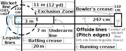 The length of an indoor cricket pitch is the same as a conventional cricket pitch, and has 3 stumps at each end, but there the similarities end. The pitch is marked in line with the stumps at each end, and is 1.83 metres in width at the batting end and 2.47 metres at the bowling end, with the stumps in the centre, and the middle stumps are 20 metres apart. The popping crease is in front of, and parallel with, the wicket lines at both ends. At the bowler's end, the pitch is specified as the line extending between the return creases and will be called the bowler's crease or the front foot line. The return creases of the pitch at the bowler's end is marked by a lines at right angles to the bowling crease to the line of the wickets. The return creases are marked 1.22 metres from the middle stump on the line of the wicket. The running crease (or non-striking batter's crease), which is the edge of the crease marking nearest the bowling end, is parallel to the popping crease and extends from one side of the court to the other. The distance between the running crease and the batting crease is 11 metres.[1]
