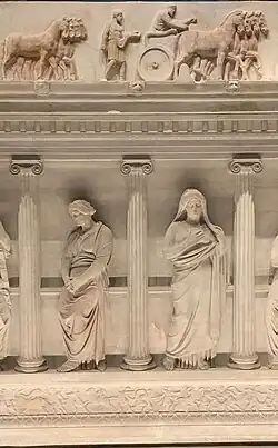 Hellenic style sarcophagus, shaped like an Ionic temple and made of Pentelic marble with polychrome reliefs.[66] The trough stands on a 0.4 m (1.3 ft) pedestal consisting, from bottom to top, of a flat band, a row of egg-and-dart motifs framing an intricate relief depicting a hunting scene, a molding and a final flat band that serves as a plinth. On top of the plinth, a row of 14 Ionic columns and four pilasters enshrine 18 female figures in mourning.[67] The columns are surmounted by an architrave. The trough measures 2.68 m × 1.38 m (8.8 ft × 4.5 ft) and 1.29 m (4.2 ft) high.[67]