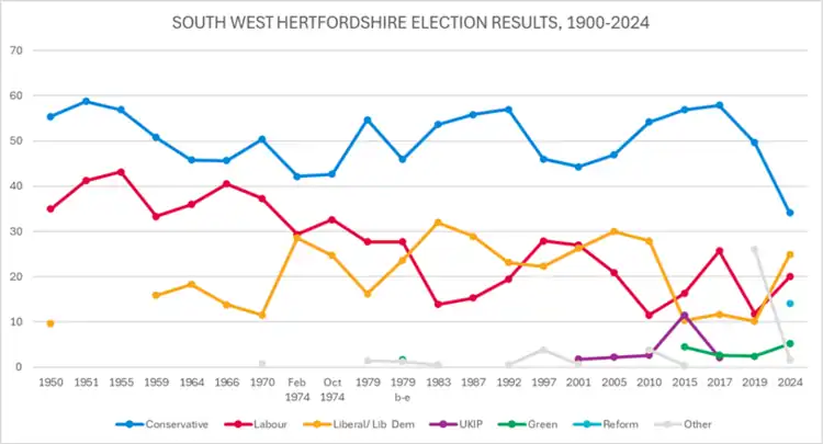 Elevated and bordering Greater London and Buckinghamshire, this part of Hertfordshire is for its residents mostly middle-class suburbia, an established haven for commuters who travel from the outer reaches of the London Underground's Metropolitan line or two railways from London which serve different parts of the seat: the West Coast Main Line and Aylesbury Line. Much of the constituency is within the Greater London Built-up Area, though it also contains Green Belt land.