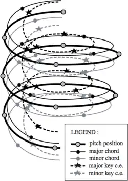 In music theory, the spiral array model is an extended type of pitch space. A mathematical model involving concentric helices (an "array of spirals"), it represents human perceptions of pitches, chords, and keys in the same geometric space. It was proposed in 2000 by Elaine Chew in her MIT doctoral thesis Toward a Mathematical Model of Tonality.[1] Further research by Chew and others have produced modifications of the spiral array model, and, applied it to various problems in music theory and practice, such as key finding (symbolic and audio[2][3]), pitch spelling,[4][5][6][7] tonal segmentation,[8][9] similarity assessment,[10] and musical humor.[11] The extensions and applications are described in Mathematical and Computational Modeling of Tonality: Theory and Applications.[12]