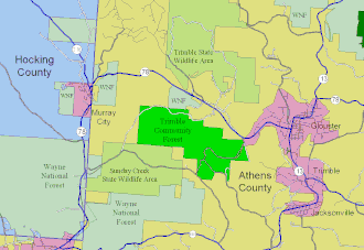 The Trimble Community Forest or Trimble Township Community Forest is a 1,200-acre (4.9 km2) forest preserve owned by the Appalachia Ohio Alliance, a land trust located in southeast Ohio. Formerly called Taylor Ridge, it was purchased in 2006 from the Sunday Creek Coal Company, and was formerly part of the Sunday Creek State Wildlife Area.[1] The land has a long history of coal, oil, natural gas, and timber production. The AOA negotiated with the Trimble Township Trustees on its use before purchase.[2] It is located in Athens County, Ohio, south of Ohio State Route 78, between Glouster, Ohio and Murray City, Ohio.