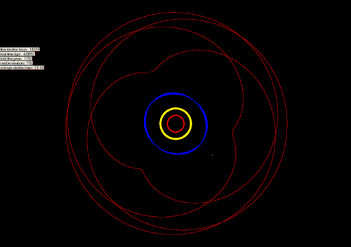 The trefoil libration of 2001 XT254. Jupiter in red, Saturn in yellow, and Uranus in blue. Neptune is the white dot at 5 o'clock.