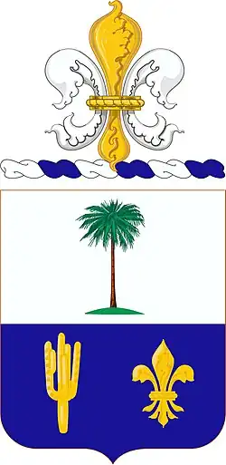 The palm tree represents Philippine service, the giant cactus Mexican Border duty and the fleur-de-lis service in France during World War I. Blue and white are the colors associated with Infantry and refer to the organization's combat service as the 163d Infantry during World War II.