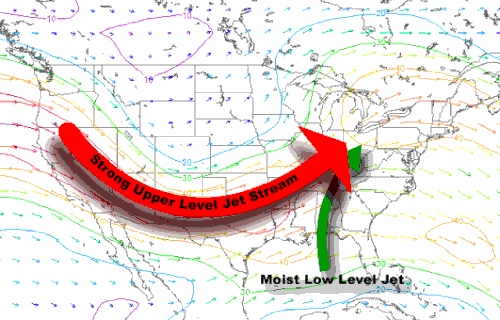 While violent tornado activity increased over the warm sector, a third band of convection developed at about 16:00 UTC and extended from near St. Louis into west-central Illinois. Based upon real-time satellite imagery and model data, differential positive vorticity advection coincided with the left exit region of an upper-level jet streak which reached wind speeds of up to 130 kn (150 mph) (66.9 m/s (241 km/h)), thereby enhancing thunderstorm growth.[11] Storms grew rapidly in height and extent, producing baseball-sized hail by 17:20 UTC in Illinois and, shortly thereafter, in St. Louis, Missouri, which reported a very severe thunderstorm early in the afternoon that, while not producing a tornado, was the costliest storm to hit the city up to that time.[12] By 19:50 UTC, supercells producing F3 tornadoes hit the Decatur and Normal areas in Illinois. As thunderstorms moved into the warmer, moister air mass over eastern Illinois and Indiana, they produced longer-lived tornadoes—one of which began near Otterbein and ended near Valentine in Indiana, a distance of 121 miles (195 km).[11]