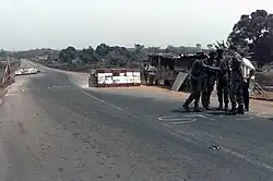 The first clashes between Taylor's and Johnson's followers took place in February 1998 after Johnson had travelled to Nigeria and met with President Sani Abacha.[5] Taylor, who was generally extremely hostile toward Nigeria and resented its influence over West Africa,[9] believed that Johnson's trip indicated that his rival and the Nigerian government plotted to overthrow him. Thus, when Johnson returned later that month, Benjamin Yeaten's feared Special Security Service (SSS) arrived at Roberts International Airport to apprehend him. The former warlord's guards fought back, however, and eventually Johnson had to be transported back to Monrovia protected by heavily armed Nigerian peacekeepers. The SSS again attacked Johnson's followers in March, as he travelled to the United States for medical treatment. Taylor once again believed that his rival's trip was in reality an attempt to plot against his government.[5] The United States' government, however, had little interest in getting involved in the disputes between the two Liberian politicians as it mistrusted both.[2] On 6 June, six members of Johnson's faction were apprehended by security forces at Roberts International Airport and "disappeared".[7]