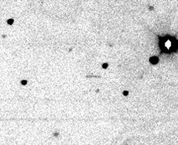 2000 SG344 seen on 29 September 2000, as a dim streak in the center of the image, moving against the background field of stars