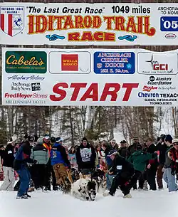 Anchorage to Campbell Airstrip:[4][5] The ceremonial start of the 33rd annual Iditarod race began at 10 am Alaska Standard Time on March 5, 2005, in Anchorage. The first "bib" position out of the starting chute on Fourth Avenue and D Street was reserved for honorary musher Jirdes Winther Baxter, the last known survivor of the children who were saved from a diphtheria epidemic by the historic 1925 serum run to Nome.[6] Baxter rode out of the starting chute on Fourth Avenue and D Street in the sled of 15-year-old Melissa Owens, who won the 138-mile (222 km) Junior Iditarod on February 27, with a time of 1 day, 51 minutes, and 27 seconds. Earlier in the year, Owens also placed second in the Junior Yukon Quest.[7][8]