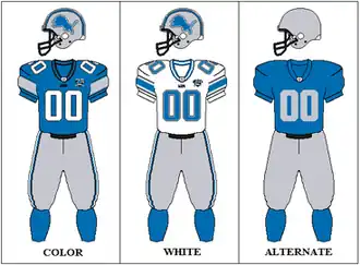 To celebrate their 75th season playing as the Lions,[note 1] the team wore a special throwback replica of the uniforms used in 1934, their first season as the Lions, for two home games. The uniforms had blue jerseys with silver lettering, solid silver pants, blue socks, and solid silver helmets (as helmets were leather back then). This replaced their black alternate jersey used in the 2005 to 2007 seasons.