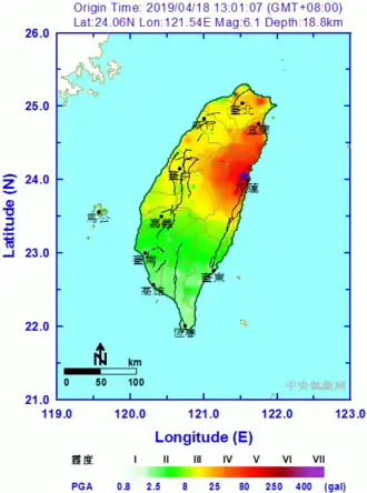 The 2019 Hualien earthquake (Chinese: 418花蓮地震) struck Hualien County, Taiwan with a moment magnitude of 6.1 on 18 April at 13:01 local time (05:01 UTC).[2]