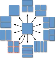 "T-shaped" partitioning patterns are introduced, a feature developed for VP10, as well as horizontal or vertical splits into four stripes of 4:1 and 1:4 aspect ratio. The available partitioning patterns vary according to the block size, both 128×128 and 8×8 blocks can't use 4:1 and 1:4 splits. Moreover, 8×8 blocks can't use T-shaped splits.