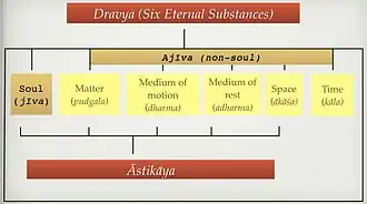In Jainism, there are five categories which ajīva can be placed into.[1] Out of these, four categories, Dharma (medium of motion), Adharma (medium of rest), Akasha (space) and Pudgala (matter) are described as the asti-kaya dravya's (substances which possess constituent parts extending in space) while the fifth category Kala is an anasti-kaya dravya (which has no extension in space).[2]