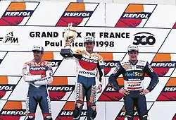 Crivillé on the podium at the Japanese Grand Prix, alongside Repsol Honda compatriots Mick Doohan (center) and Tadayuki Okada (right).