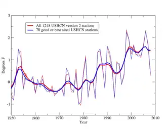 - ^ Powell 2012, p. 136: "In 2007, Watts founded SurfaceStations.org...By early June 2009, thanks to a grass roots network of volunteers, SurfaceStations.org had examined about 70 percent of the 1,221 stations [and] classified 70 of the stations as having "good or best" reliability... since 1950, temperatures recorded at the 70 "good or best" stations are indistinguishable from the rest."