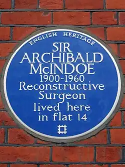 Blue plaque on McIndoe's former home at Avenue Court, 23–29 Draycott Avenue, Chelsea, London