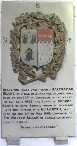 "Neare this place lyeth buried Balthazar Beare of Ashe in Brannton, Esquire, who dyed on the 10th of December in the yeare of our Lord 1682; the sonne of George Beare of Ashe, Esquire, whom he succeeded. And nigh him his wife Elizabeth, who dyed on the 5th of May 1661, daughter of Sir Walter Leach of Cadeleigh in this county, knight. Beare and Forebeare"