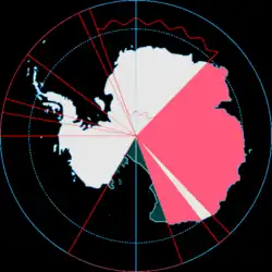 Antarctic territorial claims of Australia (in pink) and New Zealand (in turquoise). These claims have been maintained since 1933 and 1924 respectively and are mutually recognised as to sovereignty.[6]