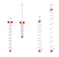 There are many variations of construction with springs. Springs can be located on the mechanical equivalent of the forearm or the upper arm, or both, as well as nearer to the base. Some lamps use tension springs, and others use compression springs. The adjacent image shows (left to right) a compression spring at rest, then under load, followed by a tension spring at rest, and then under load. Springs have a limited lifting capacity and extension length. Some springs can resonate, producing low-level unwanted noise.