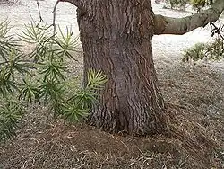 The river banksia generally grows as a tree up to 25 metres (80 ft) tall with a usually brown to grey trunk covered with a hard grey furrowed bark.[3] The tree trunk is often straight and tall as the species generally grows in sheltered forest areas. The leaves are arranged on the stems in whorls. Measuring 5–12 cm (2.0–4.7 in) long and 1–1.8 cm (0.4–0.7 in) across, they are linear in shape with serrated margins. The upper leaf surface is finely furred becoming smooth, while the undersurface is covered in white fur.[3]