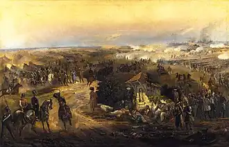 In the meanwhile, the Russian army deployed for attack. The 3. Russian light cavalry division, flanked from the left by the Muslim cavalry regiment and two companies of the Caucasus Mountain Riders rode around the Nagyerdő forest, attacking Korponay's division from the back, totally surprising them.[11] The 96. infantry battalion tried to defend themselves by forming a square formation, and repulsing the first attack of the 5. Lithuanian uhlan regiment, but they could not resist the second charge.[31] Being hit also by four heavy batteries, the weakest unit of Nagysándor's army crumbled under the attack, fleeing in the forest and in the city.[32] The retreating 96. battalion was covered by the 15. six-pounder battery, but their heroic fight could not counterbalance the overwhelming superiority of the Russian artillery, many of their cannons becoming unusable, and the left leg of the leader of the battery, Captain Márton Csányi, being shot off.[33] After the Hungarian artillery withdrew from the right flank, the 7. Russian Infantry Division was able to reach the forefront of the brickworks unhindered, but the batteries hastily installed here by them could not cause much harm to the enemy, because the 3. light cavalry and the Muslim riders milled with the retreating Hungarian infantry and the mounted national guards sent the Hungarian commandment from the reserve.[33]