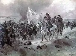 The initial clash favoured the Dutch and Danish squadrons. The disparity of numbers – exacerbated by Villeroi stripping their ranks of infantry to reinforce his left flank – enabled Overkirk's cavalry to throw the first line of French horse back in some disorder towards their second-line squadrons. This line also came under severe pressure and, in turn, was forced back to their third-line of cavalry and the few battalions still remaining on the plain.[58] But these French horsemen were amongst the best in Louis XIV's army – the Maison du Roi,[59] supported by four elite squadrons of Bavarian Cuirassiers. Ably led by de Guiscard, the French cavalry rallied, thrusting back the Allied squadrons in successful local counterattacks.[60] On Overkirk's right flank, close to Ramillies, ten of his squadrons suddenly broke ranks and were scattered, riding headlong to the rear to recover their order, leaving the left flank of the Allied assault on Ramillies dangerously exposed. Notwithstanding the lack of infantry support, de Guiscard threw his cavalry forward in an attempt to split the Allied army in two.