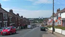 The area north of Bear Road is sometimes described as East Preston, because it was the easternmost section of Preston parish.[3][4] This part developed in the end of the 19th century as a densely populated residential area, and the name Coombe Road area—in reference to another of the main roads—is also used for this part.[5] Meadowview is a late-20th-century housing estate on the northern edge of the area, adjoining Bevendean.[6] The area to the south of Bear Road is covered by two cemeteries.[7] Beyond these are some more terraced residential streets—some of the most densely populated in Brighton—covering the hillside towards Elm Grove (another major west–east road) and the Hanover neighbourhood.[8]
