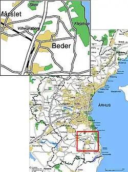 Beder is a town with a population of 4,372 (9 January 2012)[1] in Jutland in Denmark. Some consider Beder & the neighbouring town of Malling as one urban area. DST has since 2012 considered Beder and Malling as one urban area making it the 84th largest in Denmark with a total population of 9,430 in 2025.[2]