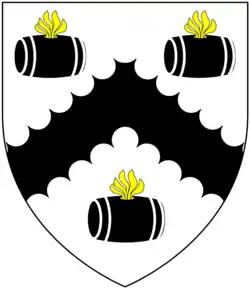 Arms of Incledon of Incledon and Buckland in the parish of Braunton, North Devon: Argent, a chevron engrailed between three tuns sable fire issuing from the bung hole proper.[1]Canting arms "incend-tun"