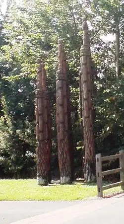 At points along the Black Country Route large sculptures can be seen. Some are very large and located in the roundabouts. An example of one of the smaller well-hidden ones is the group of wooden statues designed by Robert Koenig called "Steel Columns." "This sculpture was made from 15 lengths of sweet chestnut which stretch up to 6 metres in height. The male and female figures depicted are based on those found in old Victorian photographs of Bilston. The title "Steel Columns" is a reference to Bilston’s steel making background and the connection the figures had with this history."[1]