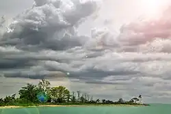 On September 3, 1821, the wooden tower was destroyed in the Norfolk and Long Island hurricane and was replaced with a 40-foot (12.1 meter) octagonal stone tower at a cost of $2300.53.[7][5][6] Completed in 1823, the new tower was made of coursed sandstone ashlar and rubble mortar and was claimed by its builder to "withstand the storm of ages."[8] This boisterous claim was countered by Edmund Blunt, an American Coast Pilot, who stated, "a more contemptible Lighthouse does not disgrace Long Island Sound, most shamefully erected and badly kept."[8] In 1835, $2052.63 was used to preserve the buildings on Fayerweather Island, including the lighthouse.[6] Three years later, in 1838, on the report of a Captain Gregory, another $1529.60 was used to build a seawall to protect the buildings.[6] Another $15,000 would be used from 1847 through 1849 to complete the seawall.[6] The original keeper's quarters, then referred to as a "dilapidated old edifice", was replaced in 1879.[5]