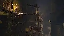 Blighttown is a major location in the 2011 game Dark Souls, created by the Japanese game company FromSoftware and directed by Hidetaka Miyazaki. It is a hostile settlement area and swamp located beneath the surface that is built on crumbling scaffolding architecture surrounding pillars that hold up the surface location called the Undead Burg.[1] It is an area that players are required to travel through so that they can activate one of two Bells of Awakening to progress through the game. Blighttown consists of main levels, one upper and one lower; players will start at the former upon arrival from an area called the Depths and descend to the latter. The upper level is a series of walkways leading to the swamp area at the lower level; the swamp inflicts both slowness and poison to the player character upon contact.[2] The Dark Souls modder Scott "Grimrukh" Mooney revealed from a tweet that the overall Blighttown structure is made up entirely of ten reused wood assets; five of them are panels, three are panels, and two others are planks. Issy van der Velde of GamesRadar noted how easy it would have been to overlook the reused wood assets because of the level's difficulty and that it is one of many instances of FromSoftware reusing game assets.[3]