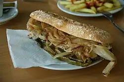 The bocadillo (lit.'small bite') or bocata (in Cheli), in Spain, is a sandwich made with Spanish bread, usually a baguette or similar type of bread, cut lengthwise. Traditionally seen as a humble food, its low cost has allowed it to evolve over time into an iconic piece of cuisine. In Spain, they are often eaten in cafes and tapas bars.[1]