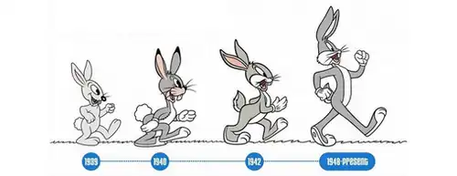 Thorson had been approached by Tedd Pierce, head of the story department, and asked to design a better look for the rabbit. The decision was influenced by Thorson's experience in designing hares. He had designed Max Hare in Toby Tortoise Returns (Disney, 1936). For Hardaway, Thorson created the model sheet previously mentioned, with six different rabbit poses. Thorson's model sheet is "a comic rendition of the stereotypical fuzzy bunny". He had a pear-shaped body with a protruding rear end. His face was flat and had large expressive eyes. He had an exaggerated long neck, gloved hands with three fingers, oversized feet, and a "smart aleck" grin. The result was influenced by Walt Disney Animation Studios' tendency to draw animals in the style of cute infants.[11] He had an obvious Disney influence, but looked like an awkward merger of the lean and streamlined Max Hare from The Tortoise and the Hare (1935) and the round, soft bunnies from Little Hiawatha (1937).[12]