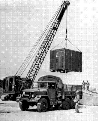 ![]() A conex box hoisted onto a US Army truck | |