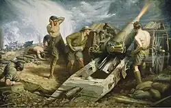 The Canadian Expeditionary Force saw their first battle in March 1915 in the French town of Neuve Chapelle.[28] After arriving from Salisbury Plain in England, the Canadian forces were instructed to prevent the Germans from reinforcing the sector of Neuve Chapelle. This would allow the British 1st Army, under General Douglas Haig, to successfully push through German lines and establish a new Allied front line on conquered territory.[29]