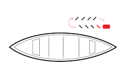 The draw stroke exerts a force opposite to that of the pry. The paddle is inserted vertically in the water at arm's length from the gunwale, with the power face toward the canoe, and is then pulled inward to the paddler's hip. A draw can be applied while moving to create a running or hanging draw. For maximum efficiency, if multiple draw strokes are required, the paddle can be turned 90° and sliced through the water away from the boat between strokes. This prevents the paddler from having to lift the paddle out of the water and replace it for each stroke. |