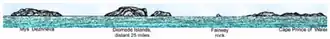 Headlands and islands of the Bering Strait as seen from a point 25 miles (40 km) south of the Diomede Islands. Cape Dezhnev on the far left.