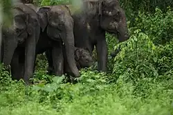 The moist climate and undisturbed nature of the rocky mountainsides appear to have allowed a rich variety of wildlife to thrive, although the Cardamom and Elephant Mountains are poorly researched and the wildlife that is assumed to be here remains to be catalogued. They are thought to be home to over 100 mammals, such as the large Indian civet and banteng cattle, and most importantly the mountains are thought to shelter at least 62 globally threatened animal species and 17 globally threatened trees, many of them endemic to Cambodia.[23] Among the animals are fourteen endangered and threatened mammal species, including the largest population of Asian elephant in Cambodia and possibly the whole of Indochina although this still needs to be proved. Other mammals, many of which are threatened, include Indochinese tiger, clouded leopard (Pardofelis nebulosa), dhole (a wild dog) (Cuon alpinus), gaur (Bos gaurus), banteng (Bos javanicus), the disputed kting voar (Pseudonovibos spiralis), Malayan sun bear, pileated gibbon (Hylobates pileatus), Sumatran serow (Capricornis sumatraensis), Sunda pangolin and the Tenasserim white-bellied rat.[24] There are at least 34 species of amphibians, three of them described as new species to science from here.[25]