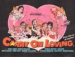 Carry On Loving is a 1970 British comedy film, the 20th release in the series of 31 Carry On films (1958–1992). It was directed by Gerald Thomas and features series regulars Sid James, Kenneth Williams, Charles Hawtrey, Joan Sims, Hattie Jacques, Terry Scott and Bernard Bresslaw alongside newcomers Richard O'Callaghan (in his first Carry On) and Imogen Hassall (in her only Carry On role).[1] The dialogue veers toward open bawdiness rather than the evasive innuendo characteristic of the earlier films in the series. The film was followed by Carry On Henry in 1971.