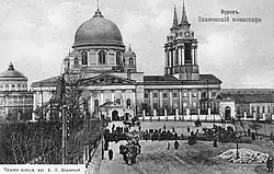 The modern Cathedral of Our Lady of the "Omen" is on the site of the city fortress of Kursk from the early 17th century.[6] In 1612, the city was captured and devastated by seventy thousand troops of Polish-Lithuanian invaders under the command of Hetman Zholkevsky. However, the city fortress remained impregnable to the enemies.[7][8] It was heroically defended under the leadership of the voevoda stolnik Yuri Ignatyevich Tatishchev.[9] The people of Kursk believed that their survival was due to the intervention of the Virgin Mary. In gratitude, they promised to build a monastery in honor of the Theotokos of Kursk, also known as the "Omen". This monastery was later moved to the royal chambers in Moscow.[10]