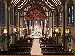 The cathedral was completed in a mixed Tudor-Gothic style: the exposed wooden beams inside the church are typical of the Tudor style, while the pointed arches of the windows and doorways evince a Gothic influence.[1] Three of the large windows inside the church were executed by the stained-glass artist Emil Frei Jr.[1]