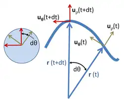 Polar unit vectors at two times t and t + dt for a particle with trajectory r ( t ); on the left the unit vectors uρ and uθ at the two times are moved so their tails all meet, and are shown to trace an arc of a unit radius circle. Their rotation in time dt is dθ, just the same angle as the rotation of the trajectory r ( t ).