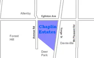 Chaplin Estates is a neighbourhood that covers the southwest portion of the Yonge and Eglinton area in Toronto, Ontario, Canada. It lies west of Yonge Street and is bounded by Eglinton Avenue to the north and Avenue Road to the west. The southern boundary is Chaplin Crescent, which runs parallel to the former Beltline Railway line, now the Beltline Trail, a scenic walking and biking trail.