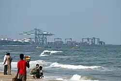 Historically, the port was responsible for the shoreline changes in the region, where the area south of the port has accreted significantly, resulting in the formation of the Marina Beach, whereas the coast in the northern region has undergone severe erosion.[38][39] Ever since the harbour was constructed, the coast north of the harbour has been experiencing erosion at the rate of about 8 m annually. The shoreline has recessed by about 1,000 m with respect to the original shoreline in 1876. It is estimated that 500 m of beach has been lost between 1876 and 1975 and another 200 m between 1978 and 1995. About 350 ha land in the coast north of the port is lost into sea.[33] On the other hand, the area south of the port is increasing 40 sq m every year due to the progradation.[39]